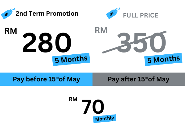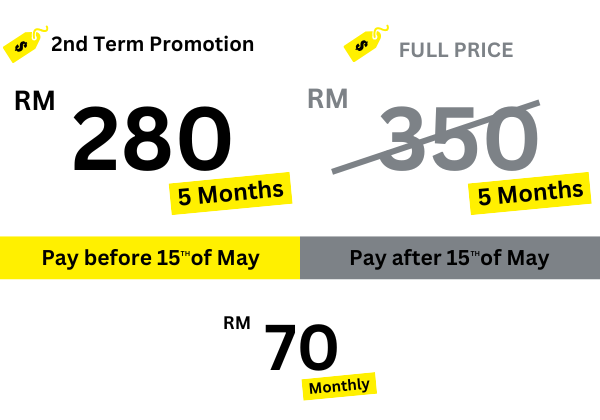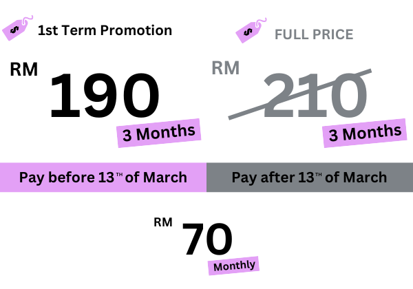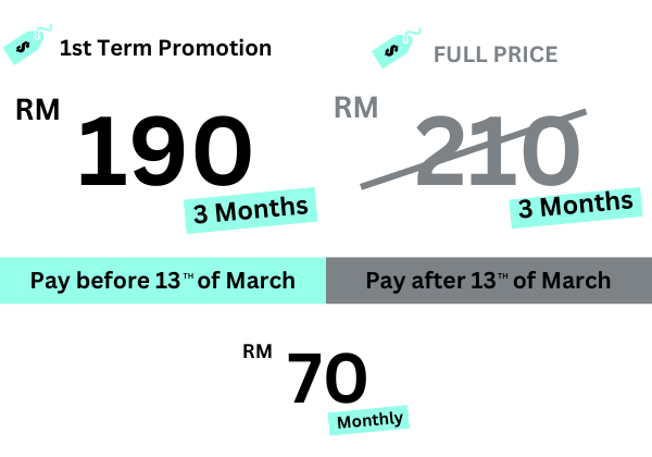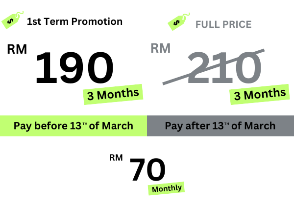 Kindly refer to the poster above. Alternatively, you can contact us at +6019 990 8339. Our team will WhatsApp you the details about the timetable, fee structure etc.